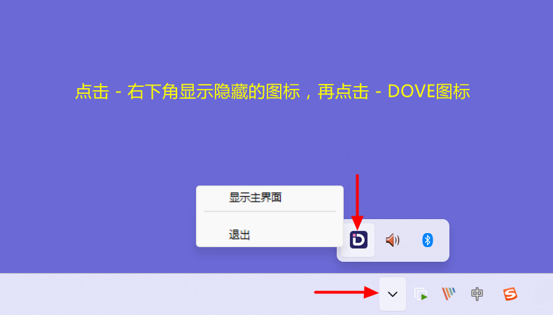 | 如要退出客户端:在电脑右下角,右键点击图标可以退出DOVE客户端 |